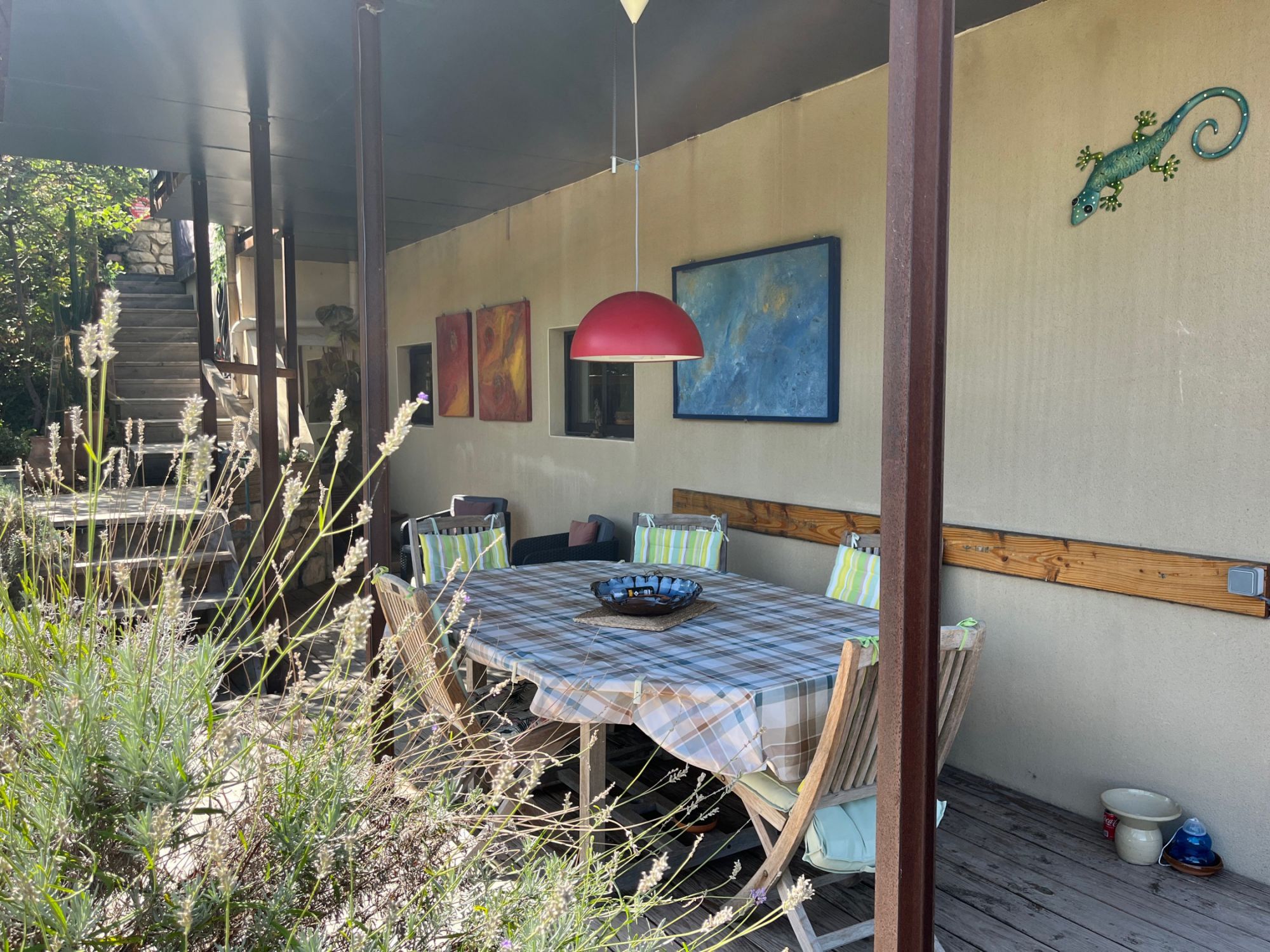 A l’extérieur, vous trouverez aussi une terrasse couverte de 24 mètres carrés avec une grande table.